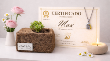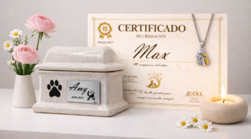 - Urna de cerámica o ecológica grabada a láser personalizada con los datos de tu mascota.
